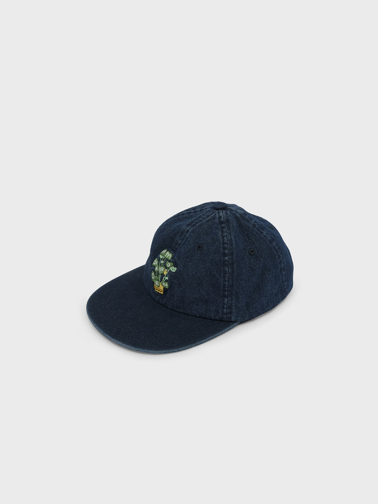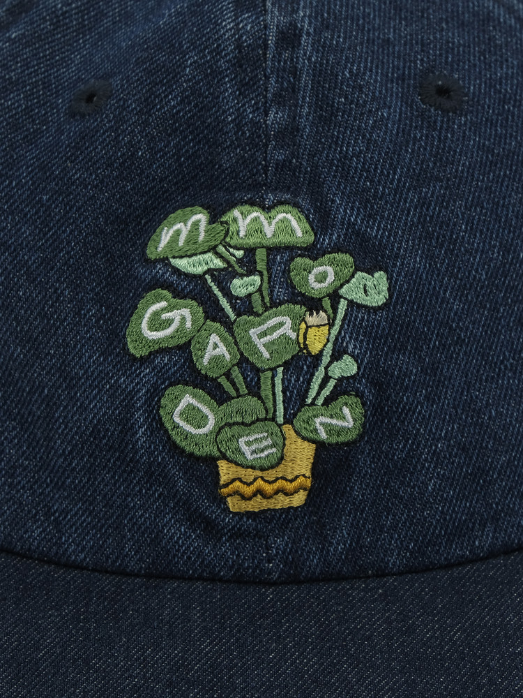 This is a denim 6-panel cap featuring the mmo flowerpot logo embroidered on the front.