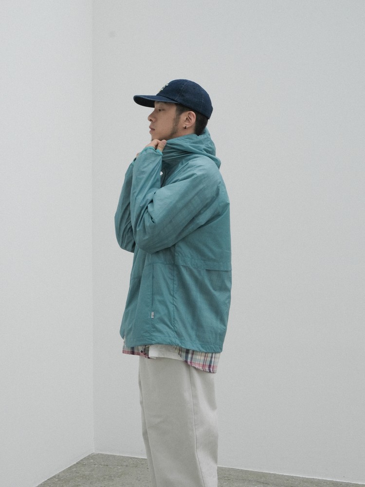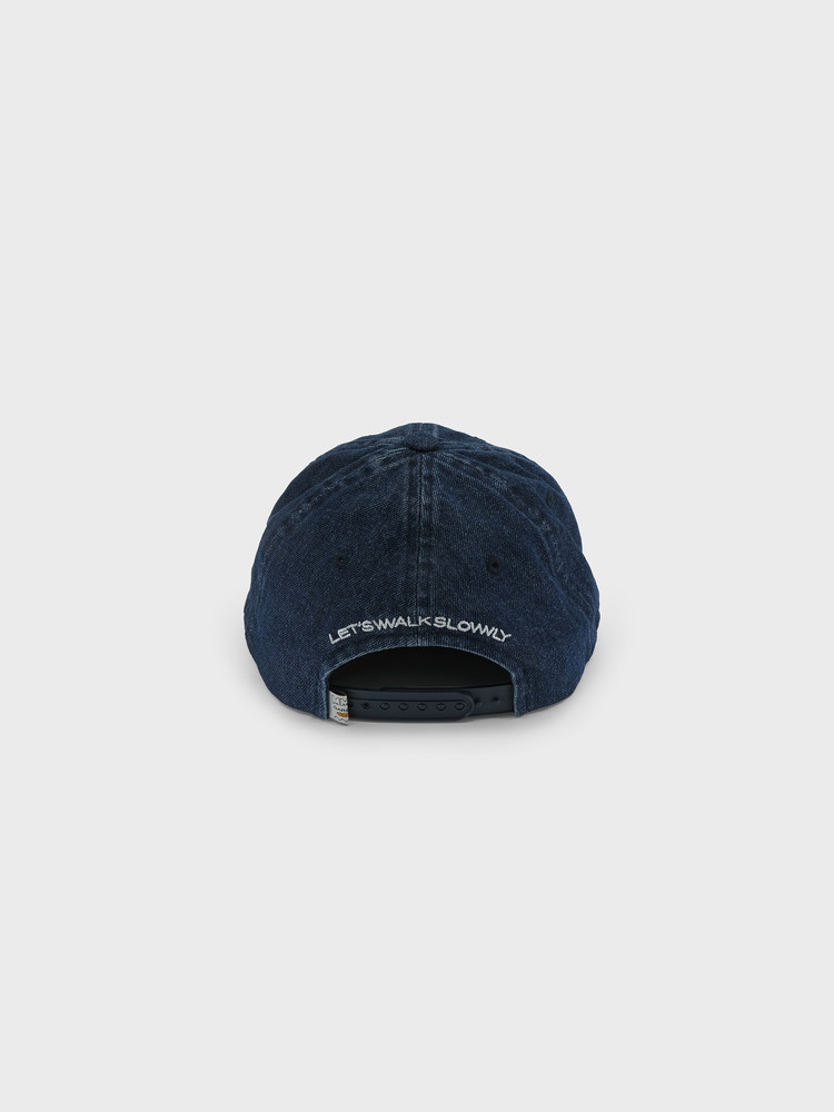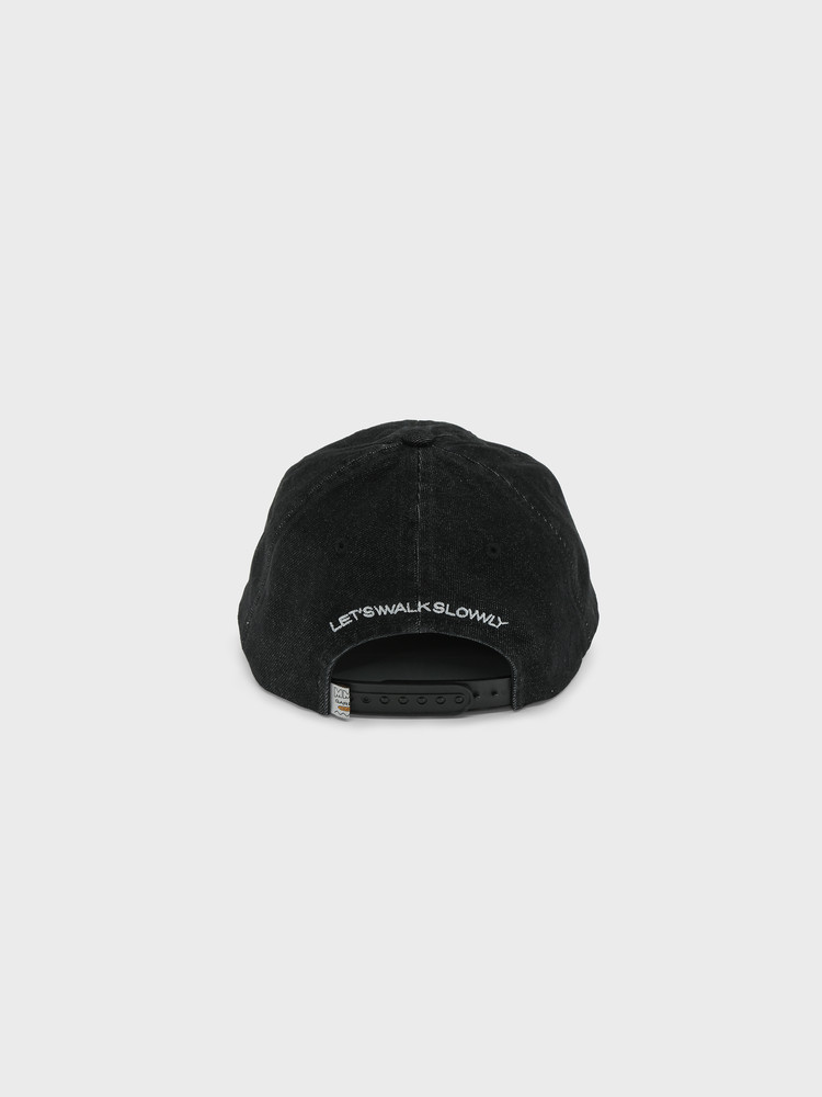 On the back panel, you'll find the embroidered slogan "let's walk slowly" and a label detail placed to the left of the snap.