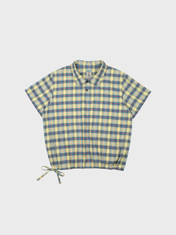 Its yellow-based check pattern combines blue, green, and red hues for a playful, kitsch vibe.