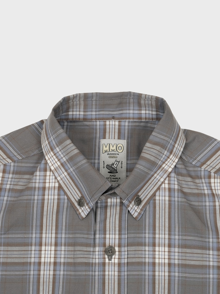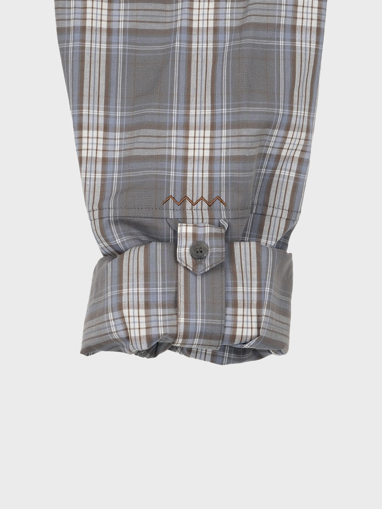 Multi-check pattern on a gray base featuring brown, sky blue, and white intersecting lines