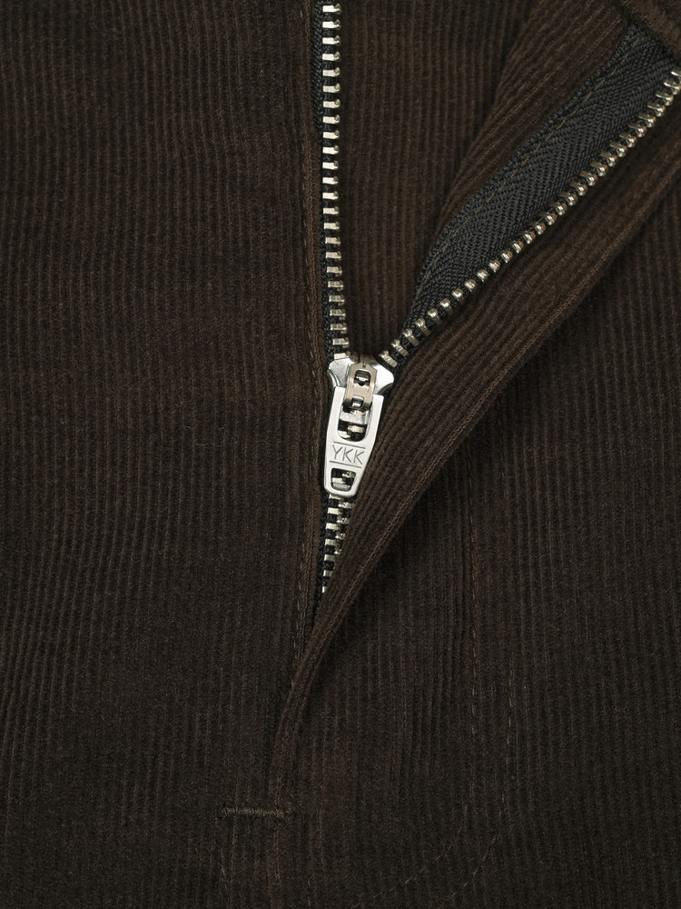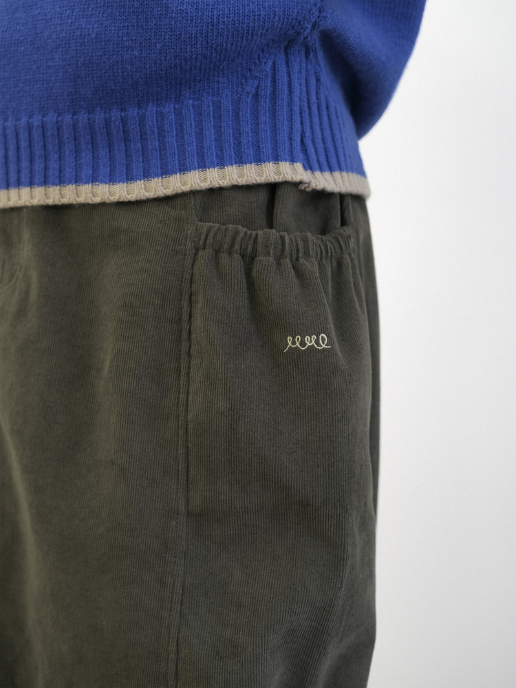Front piece label beneath the belt line and contrast embroidery on the left pocket for added accents