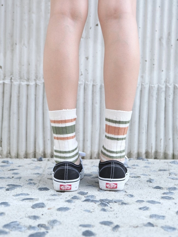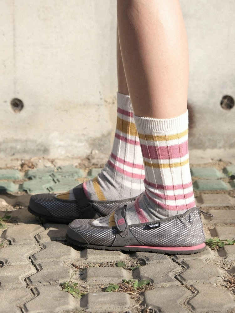 The socks are designed with the ribbing reversed on the inside and outside for a unique look.